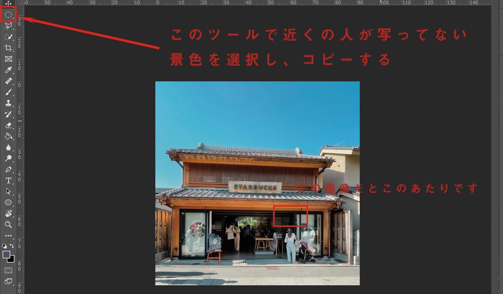 まず長方形選択ツールを選択し、消したい人物などの近くの景色を選択します。