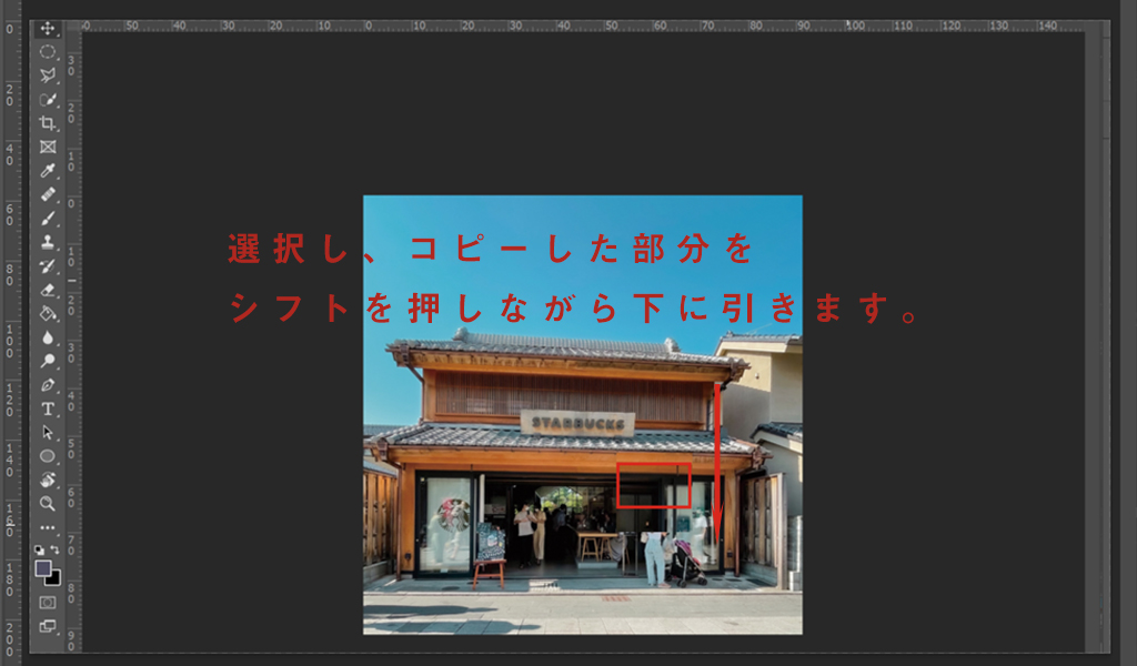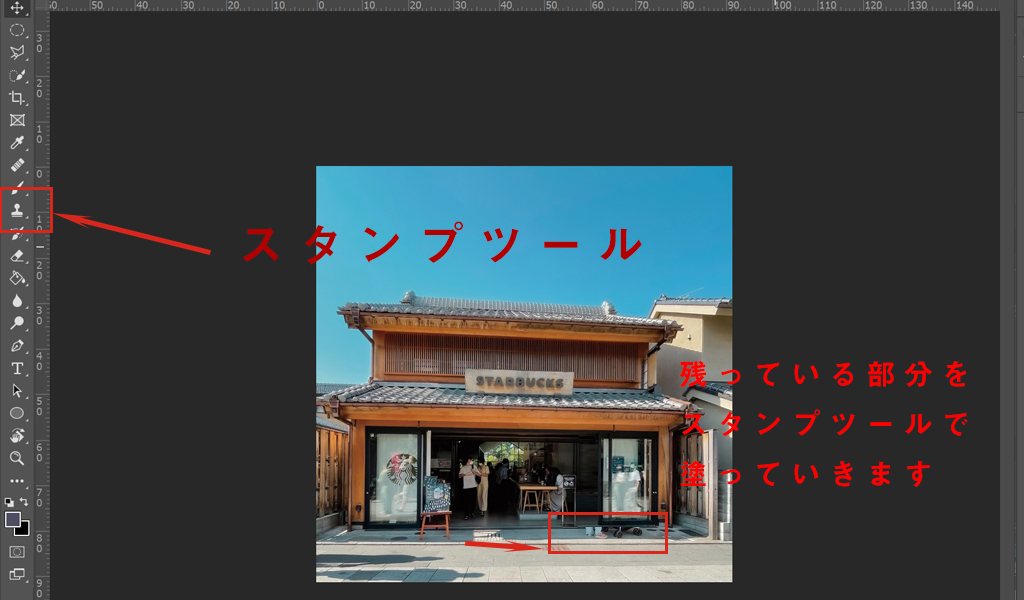 このままだと足が残ってしまうので、足の部分も同じ要領でなにも写っていない部分から借りて引っ張ります。消し込む部分が小さいので、上記のような場合はスタンプツールでもキレイに消し込むことができます。