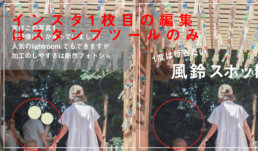 あくまで自分流ですが、デザイナー直伝の技です。アプリだとうまく消すことができないので、思い切ってフォトショに変えることをおすすめしますよ!